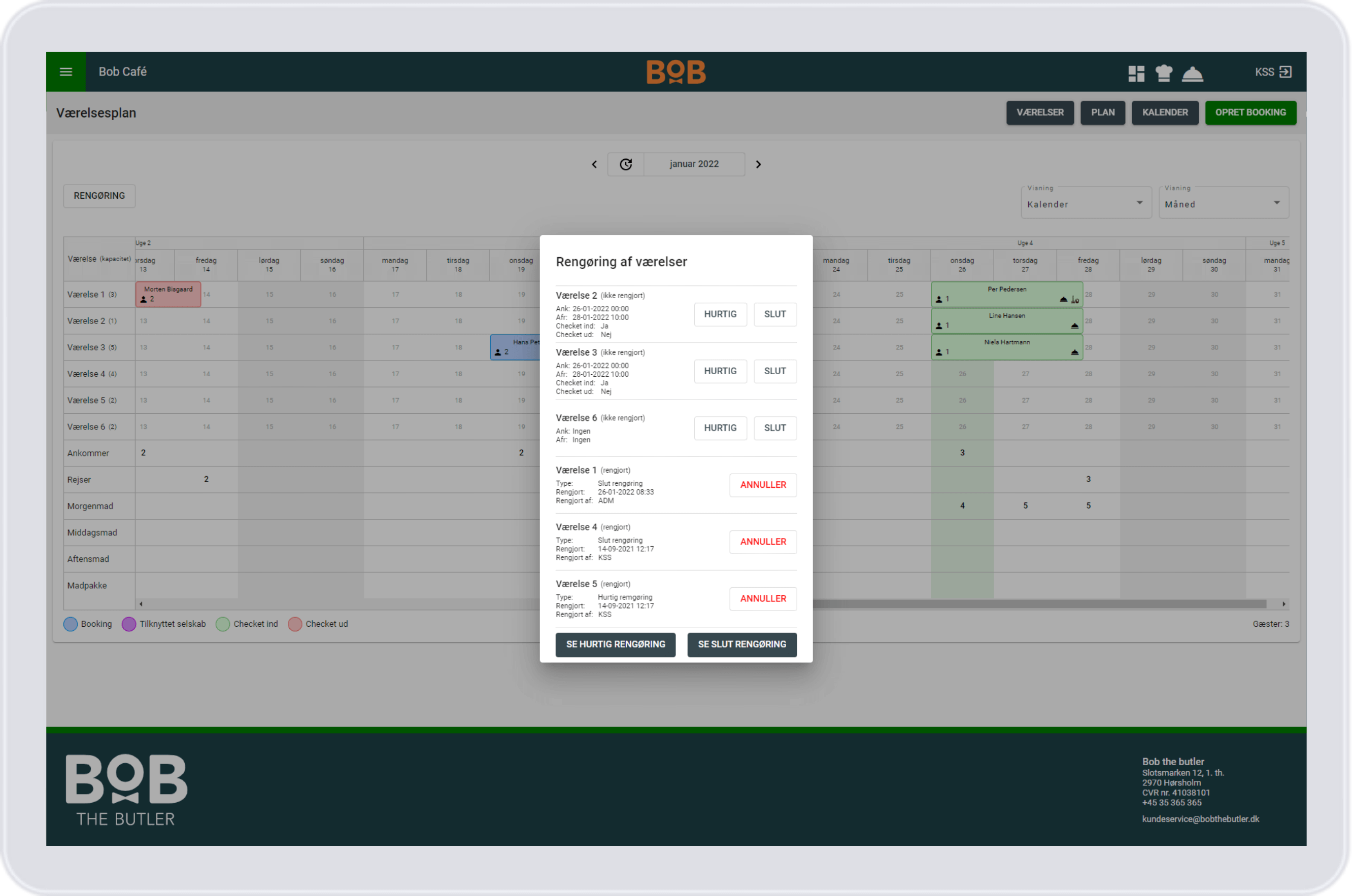 Se en liste over værelser som skal rengøres. For hvert værelse kan der vælges om der er udført en hurtig rengøring, hvor værelset bare opfriskes til den nuværende gæst eller en slutrengøring, hvor værelset er gjort klar til en ny gæst.