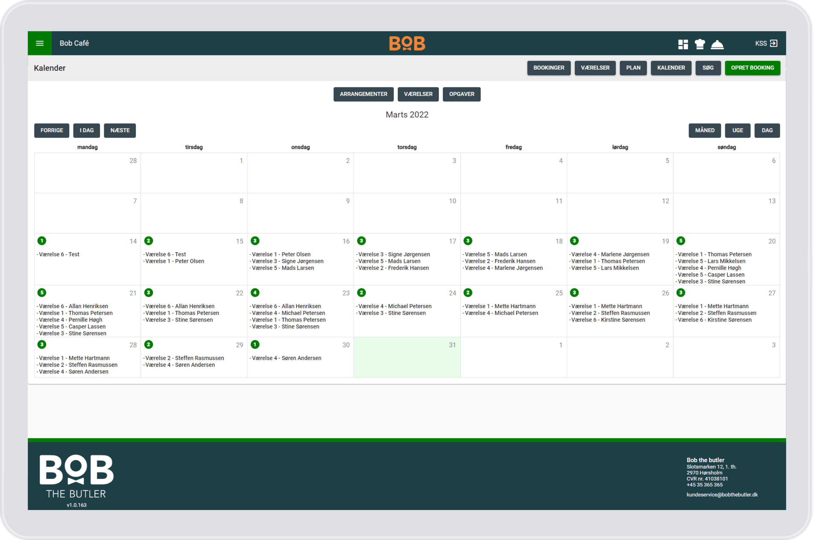 Se bookinger i kalenderen, her vises antal bookinger pr. dag, se hvilke værelse samt navnet på bookingen.