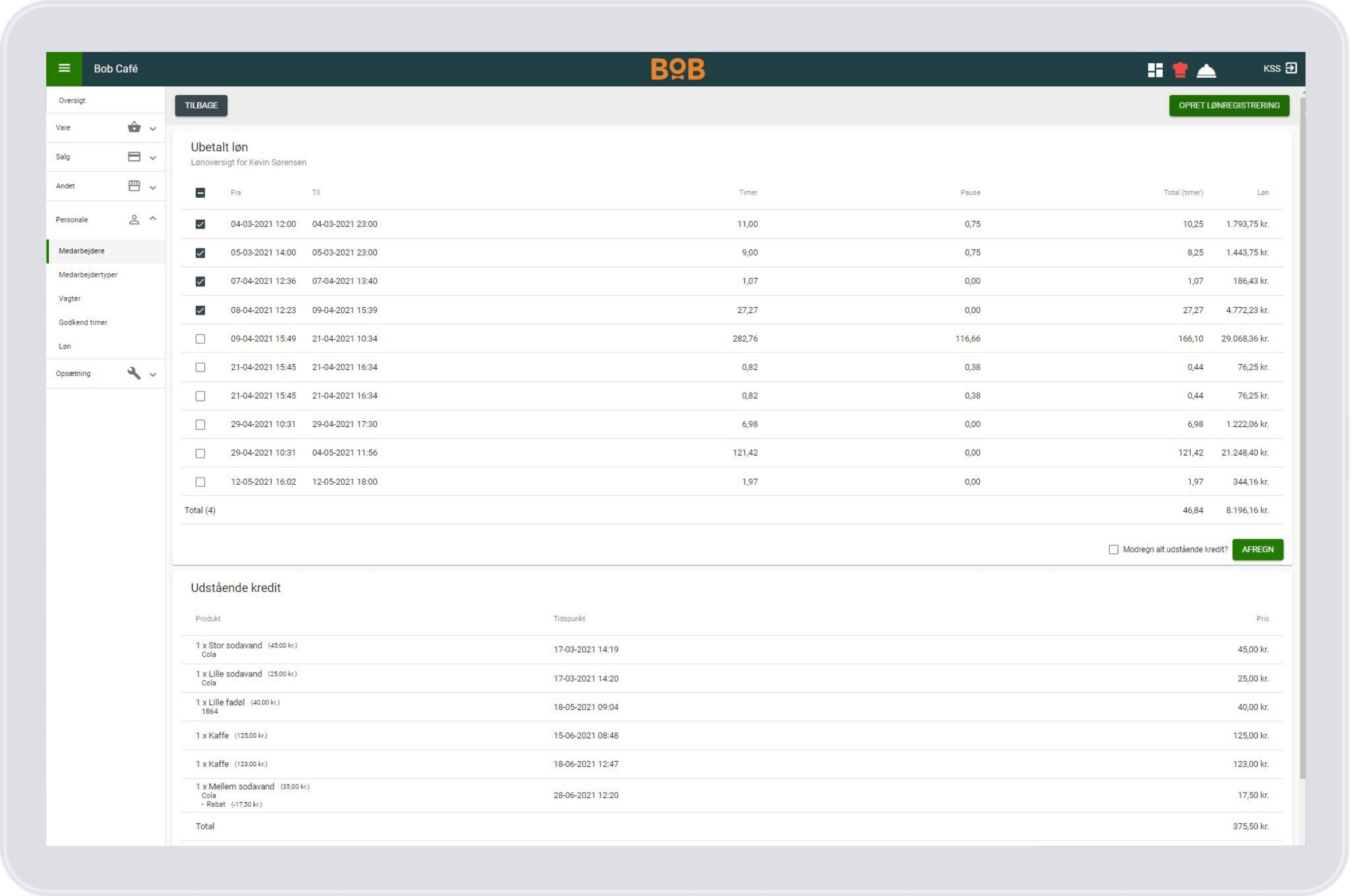 Når der skal køres løn til de ansatte, kan alle godkendte timer ses på hver enkelte medarbejder. BoB kan også vise, om medarbejderen har købt varer på regning. Du markerer blot de timer, der skal udbetales samt de varekøb som skal modregnes, for at gøre aflønningen klar.