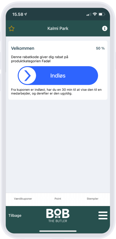 Ved valg af værdikupon, skal kunden åbne App'en, dernæst indløse sin kupon, og herpå vise tjeneren koden, og beløbet svarende til værdien på kuponen fratrækkes nu bestillingen og kuponen fjernes i App'en.