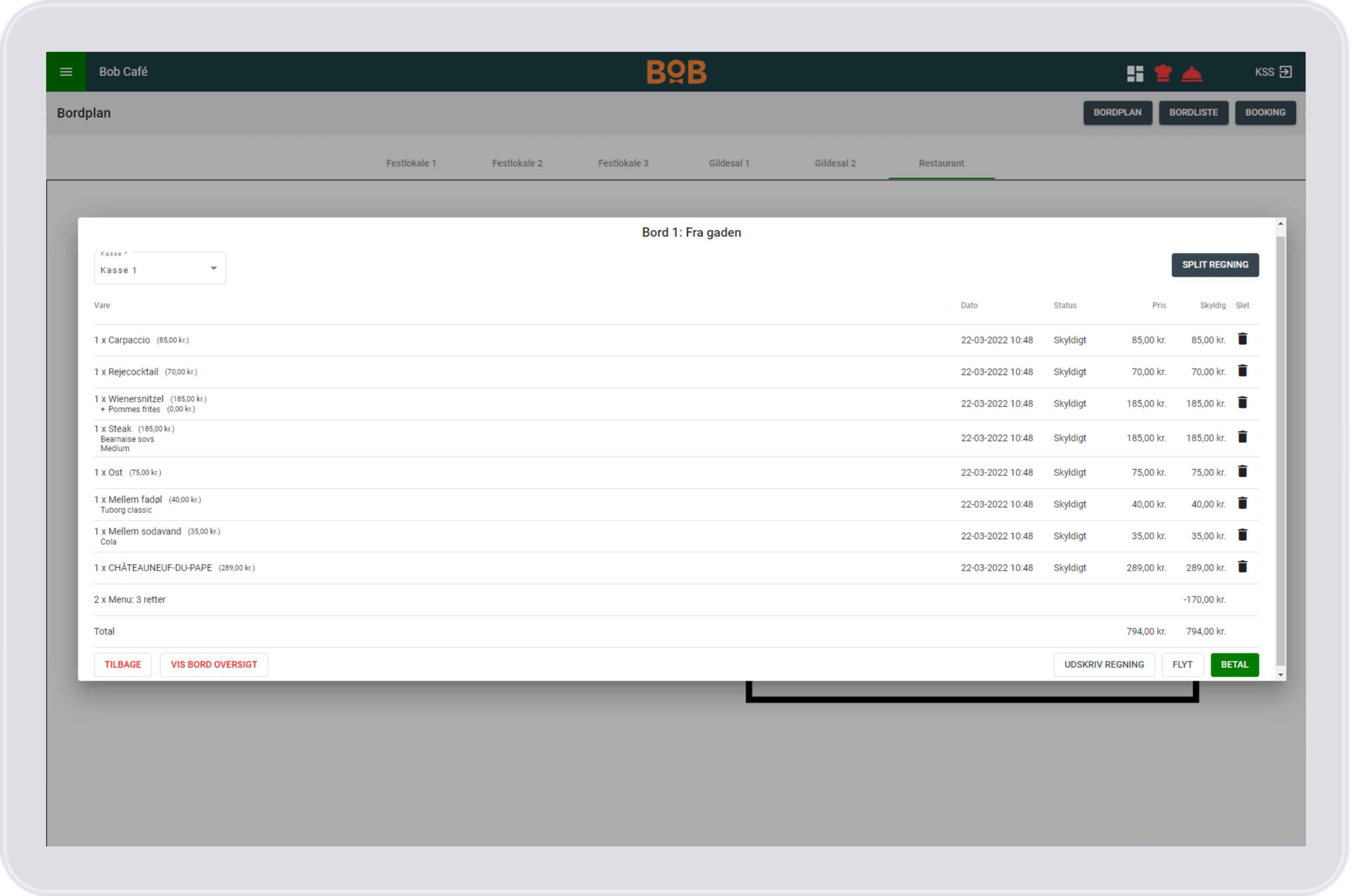 Inde på et bord kan du se og udskrive en regning, som kan afleveres til gæsten. Der er mulighed for at splitte regningen mellem flere gæster, før et bord afsluttes.